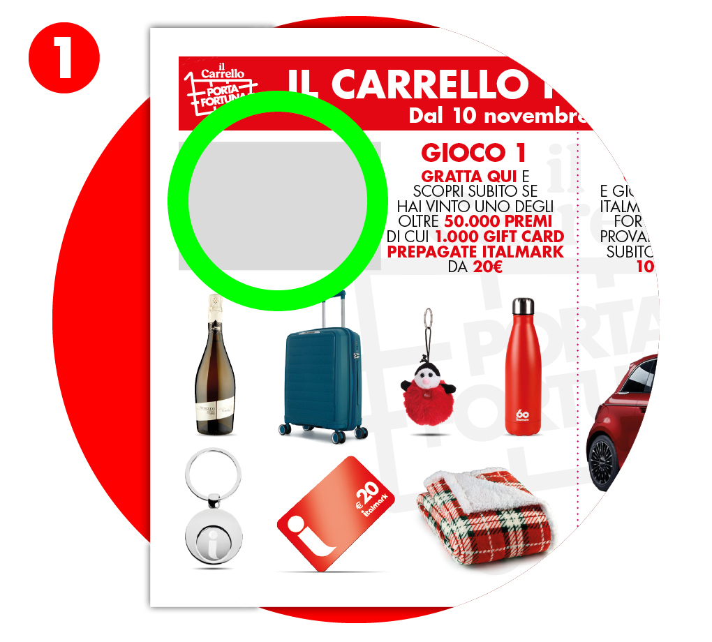 Ogni 20€ di spesa effettuata nei supermercati ad insegna Italmark ricevi 1 cartolina. Gratta il riquadro argentato nella sezione GIOCO 1 e scopri subito se hai vinto uno degli oltre 50.000 premi.