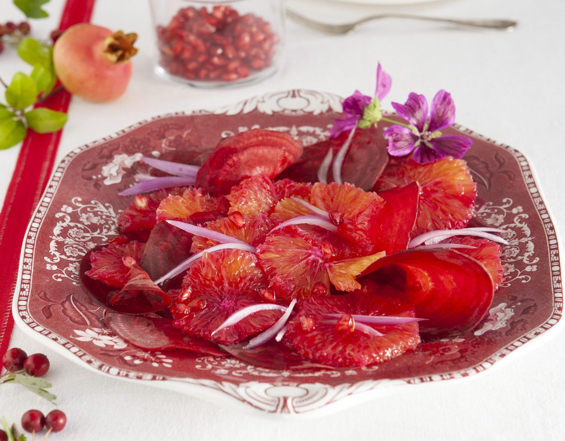 Un contorno fresco e scenografico con arance rosse, barbabietole e chicchi di melagrana. Colorato, leggero e perfetto per accompagnare i piatti delle feste.