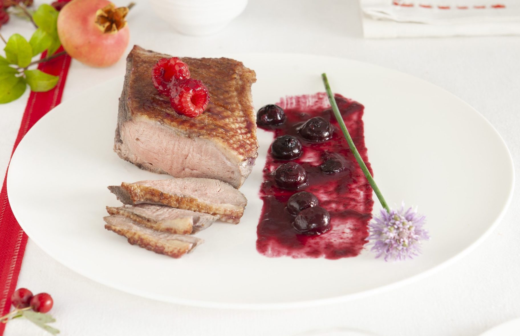 Filetto di petto d’anatra rosolato e glassato con salsa ai lamponi e mirtilli freschi. Un piatto gourmet che unisce sapori intensi e note fruttate.