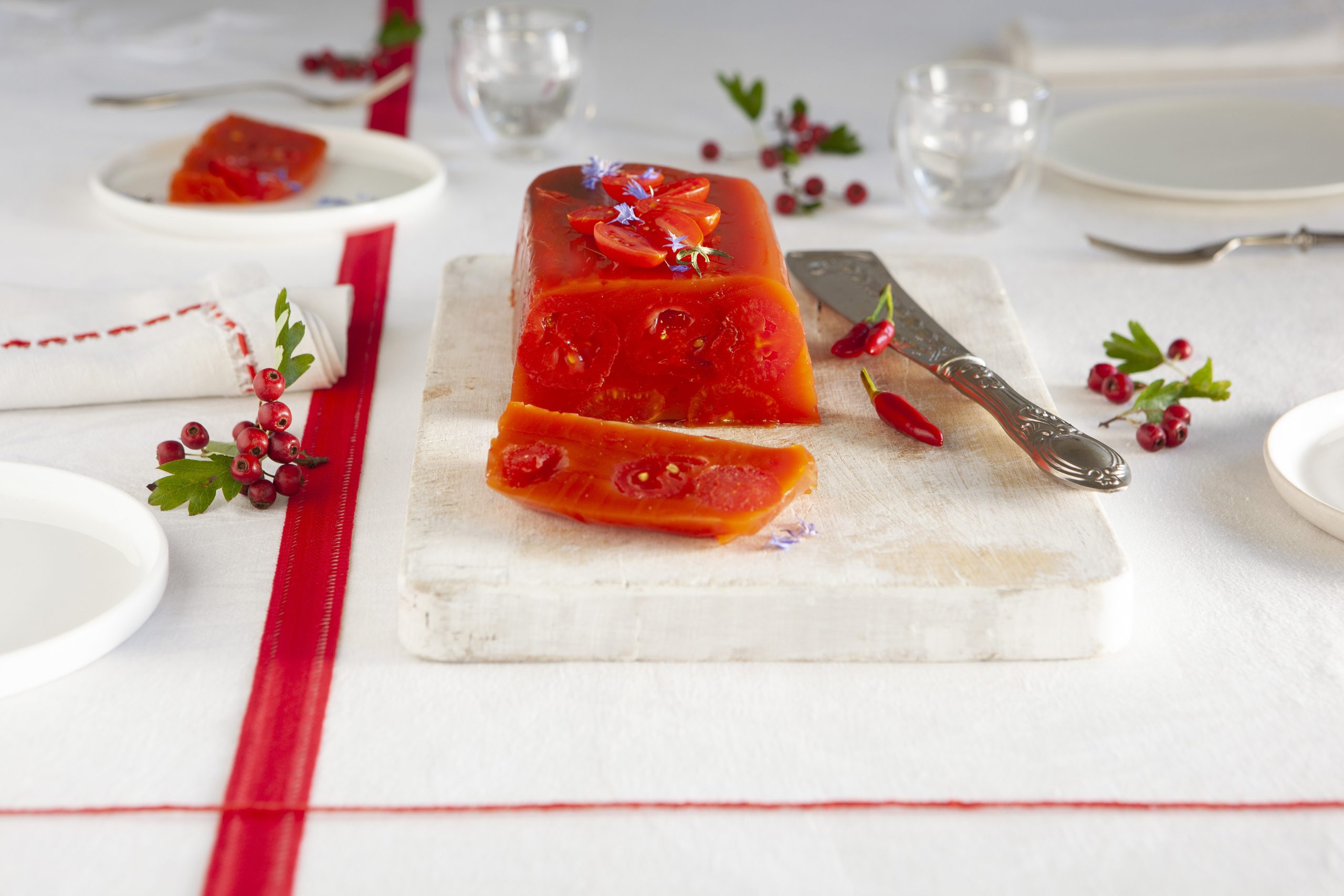 Un raffinato antipasto con pomodori canditi avvolti in gelatina di pomodoro profumata alla vaniglia. Colore, leggerezza e gusto in un piatto elegante e sorprendente.