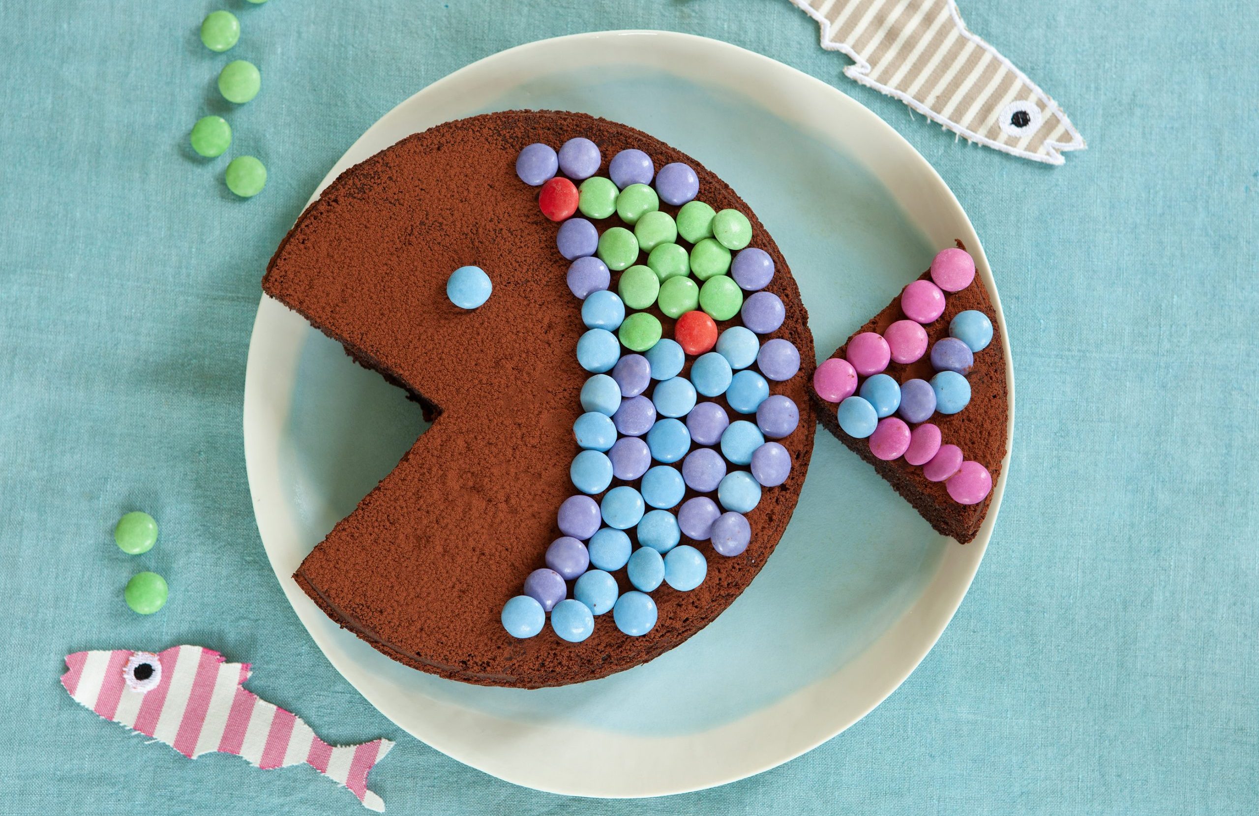 Torta soffice alla crema di nocciole, decorata a forma di pesce con smarties colorati. Un dolce simpatico e goloso perfetto per i bambini!