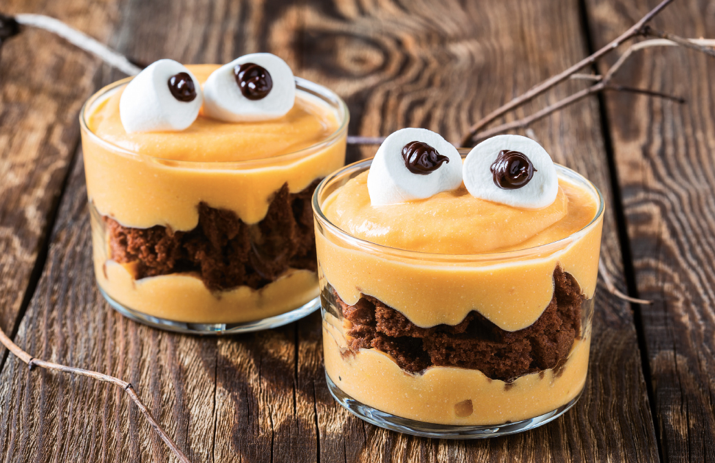 Golosi bicchierini con crema di mascarpone e arancia, alternata a strati di biscotti al cioccolato e decorati come simpatici mostriciattoli. Un dolce di Halloween facile e divertente da...