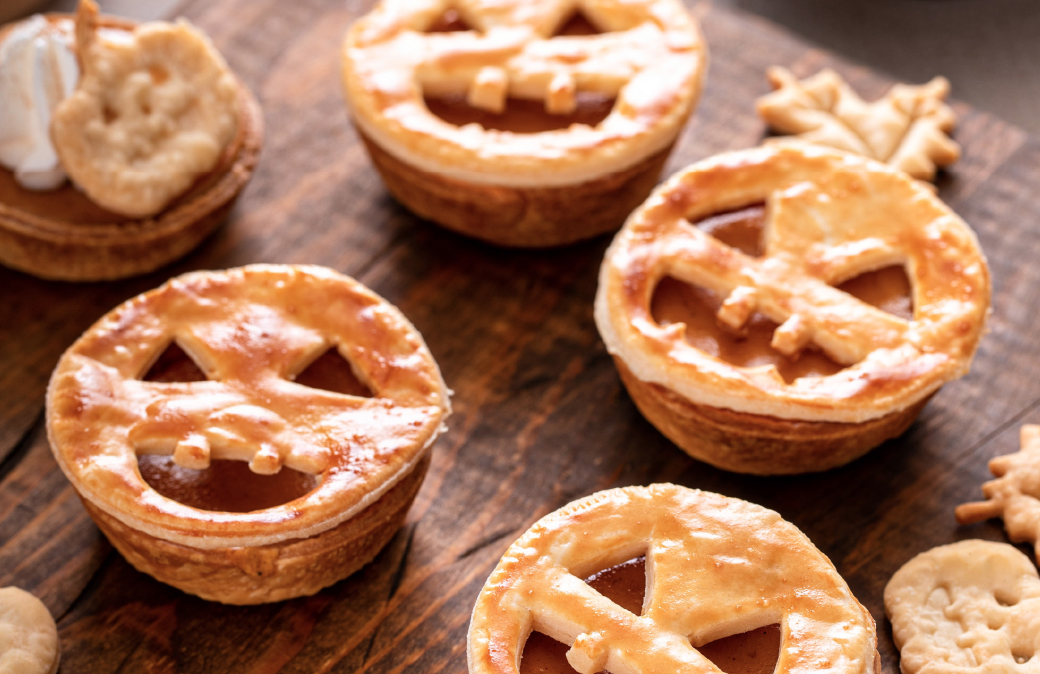 Croccanti tortine di pasta brisée farcite con crema di zucca e spezie, decorate con intagli a tema Halloween. Dolcetti simpatici e golosi da condividere con grandi e piccini.