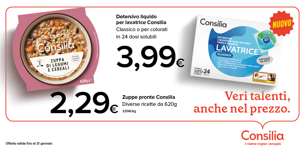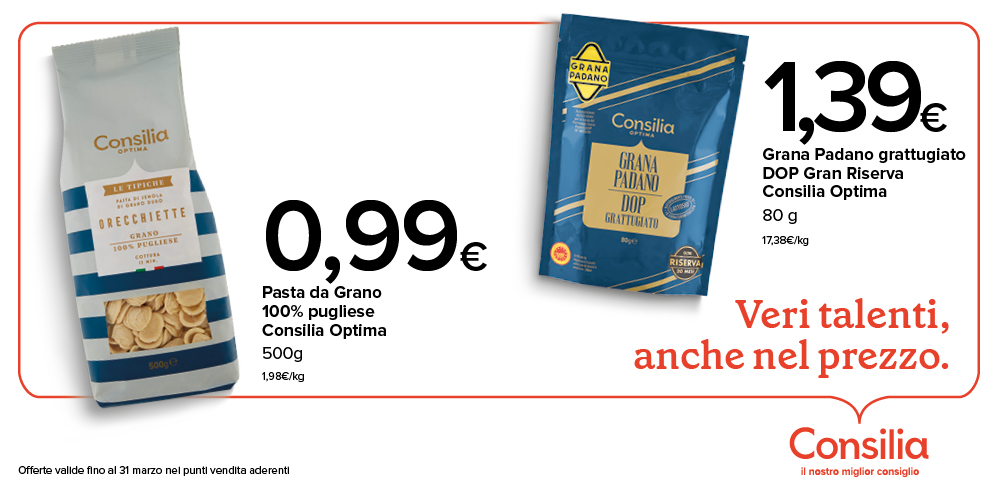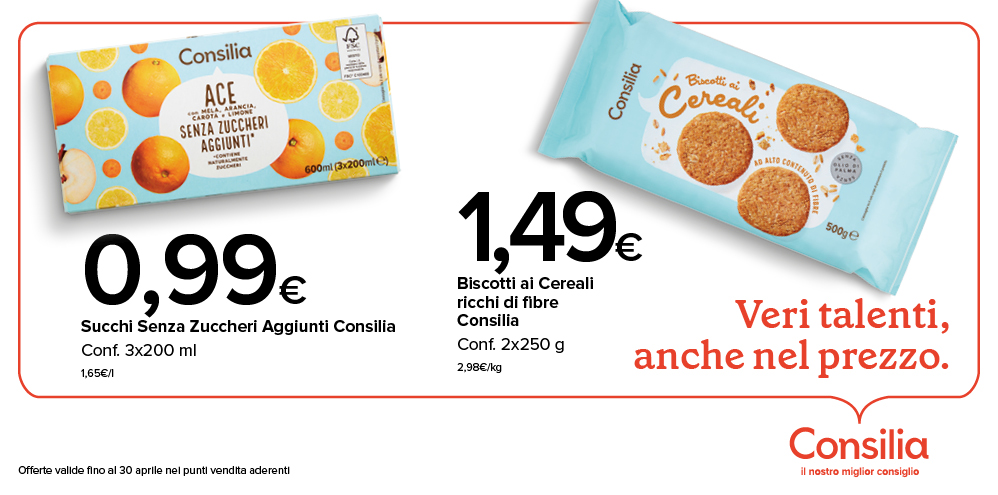 Buona, sicura, adatta a una vita moderna e dinamica. Consilia è così: una marca di prodotti per la tua tavola e per la tua casa nata dall’amore per l’Italia e per le sue eccellenze locali, affinché la tua spesa sia sempre ottima, abbondante e, soprattutto, conveniente.